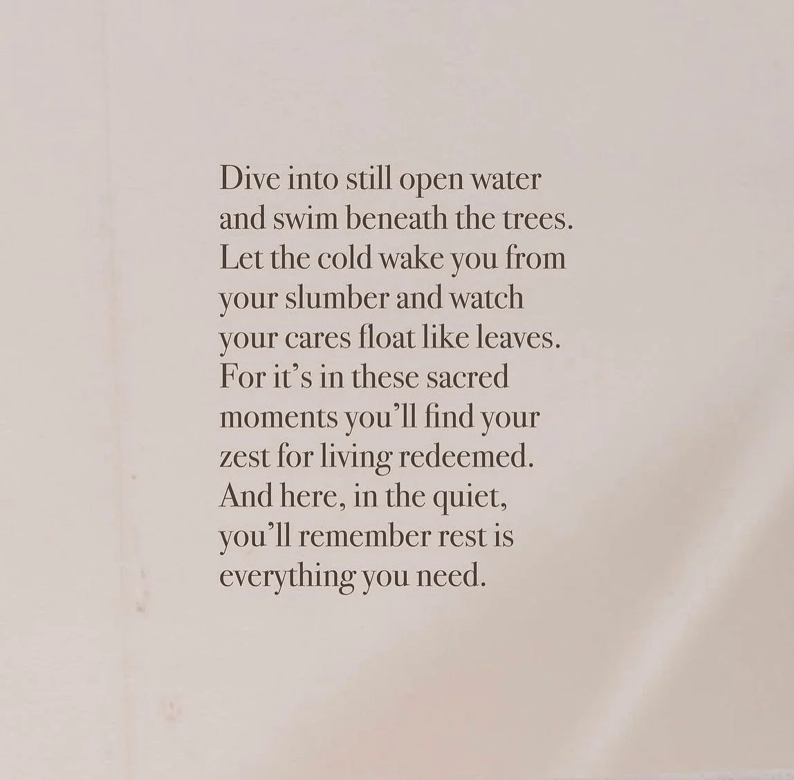 Dive into still open water and swim beneath the trees. Let the cold wake you from your slumber and watch your cares float like leaves. For it’s in these sacred moments you’ll find your zest for living redeemed. And here, in the quiet, you’ll remember rest is everything you need.